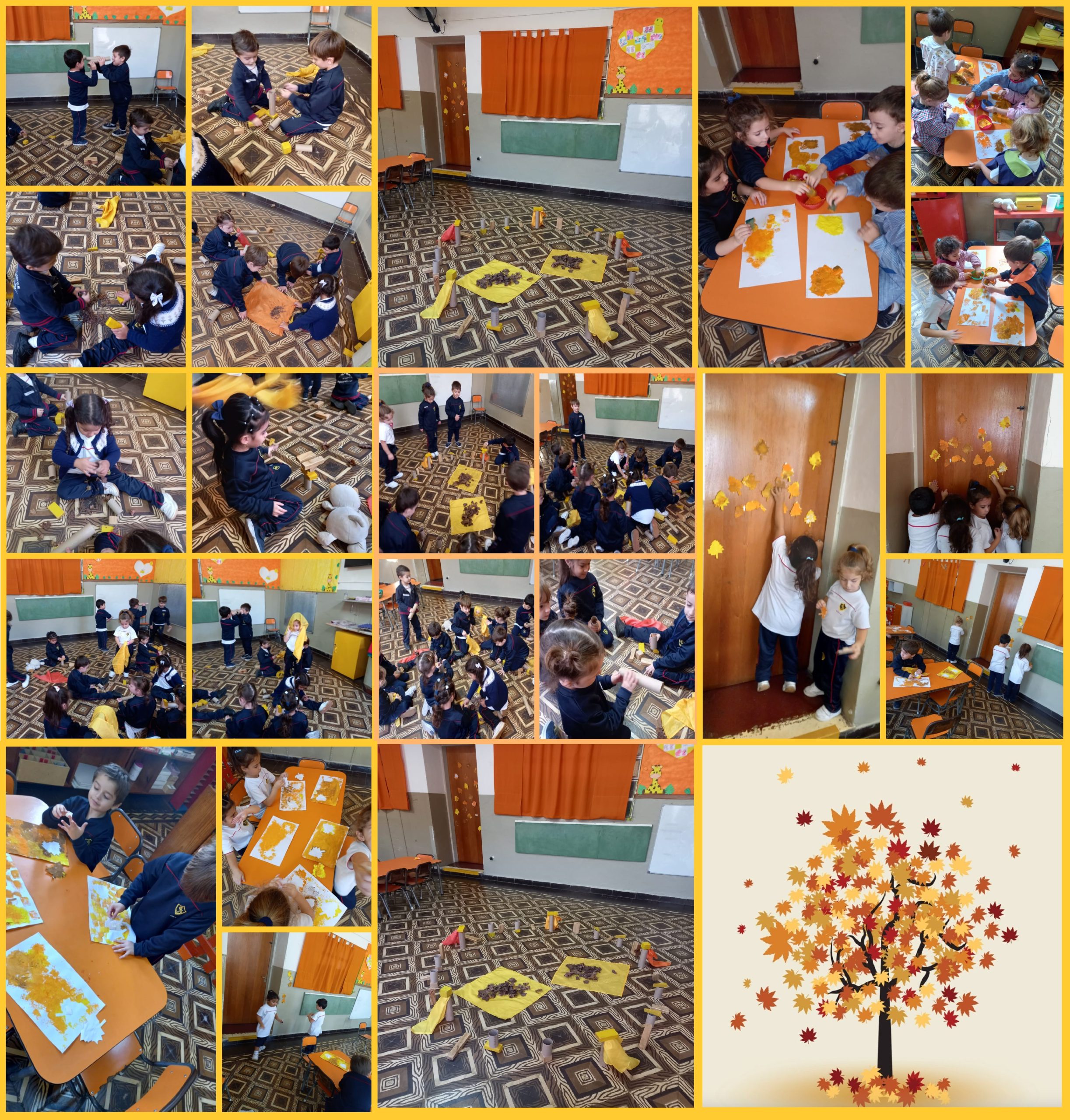 Sala 4 años “Jirafitas”Luego de escuchar el cuento «Tres hojitas» y debatir sobre lo que sucede en esta nueva estación, pusimos manos en acción y pintamos con témperas de colores otoñales. Seguido de ésto, decoramos la sala con algunas hojas sorpresas que descurbirmos cuando se seco la pintura. En la semana siguiente se llevó a caso ESCENARIO LÚDICO OTOÑAL, al ingresar a la sala los estudiantes se encontraron con distintos elementos para explorar, descubrir y jugar utilizando su creatividad e imaginación.