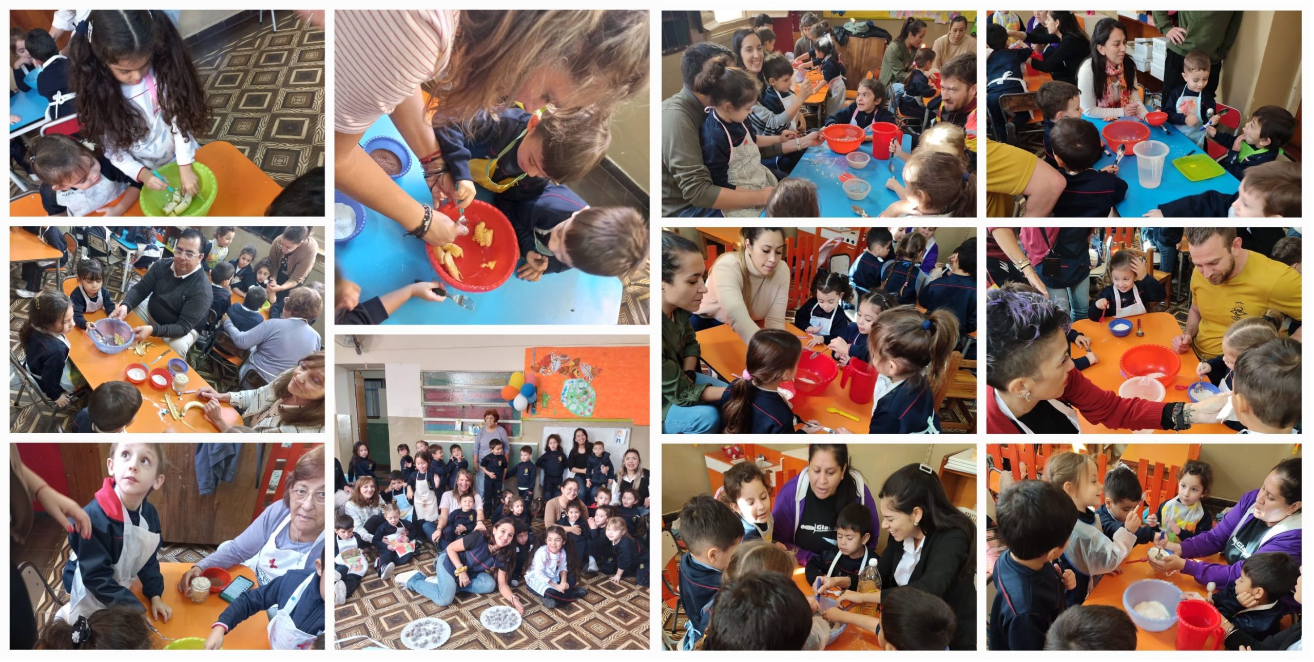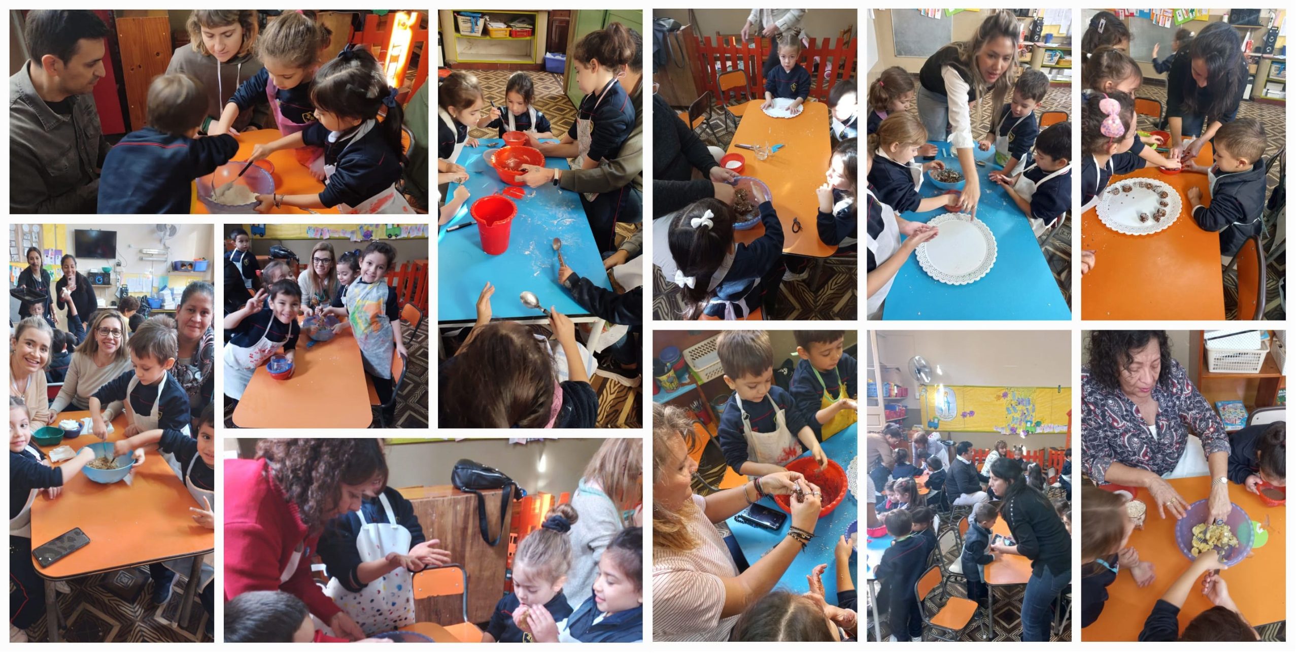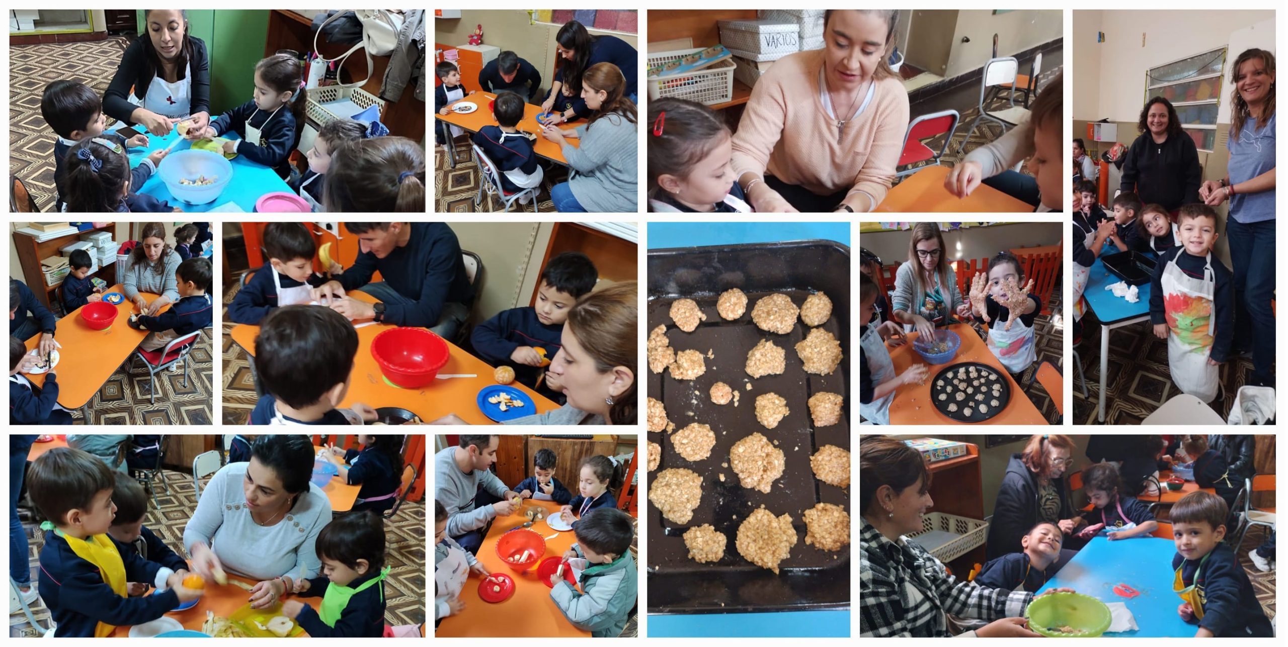 En el marco del proyecto sobre alimentación saludable, invitamos a las familias a participar de cuatro talleres de cocina donde prepararon: ensalada de frutas, pancitos integrales, galletas de avena y trufas. Todos/as pudieron tocar, oler, probar, explorar y conocer distintos ingredientes… Además descubrieron que comer alimentos saludables es muy bueno para crecer sanos y fuertes, pero también es rico y muy divertido !!!