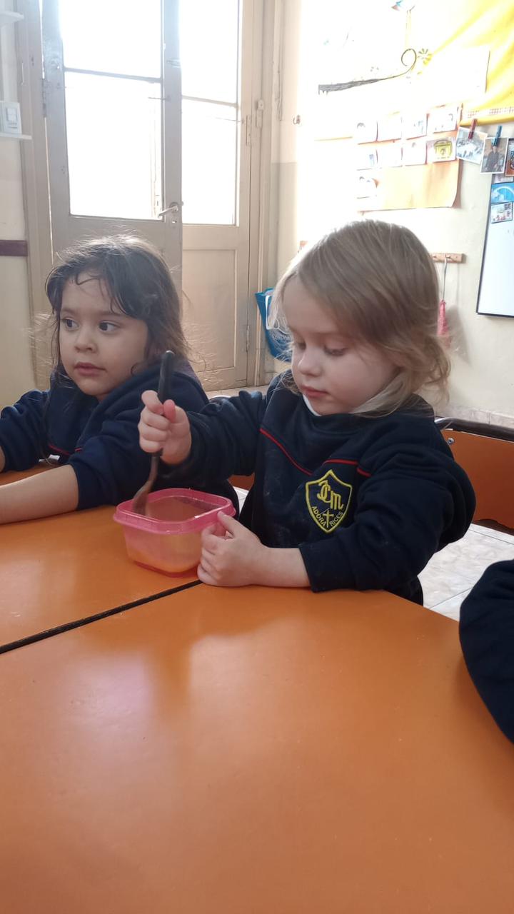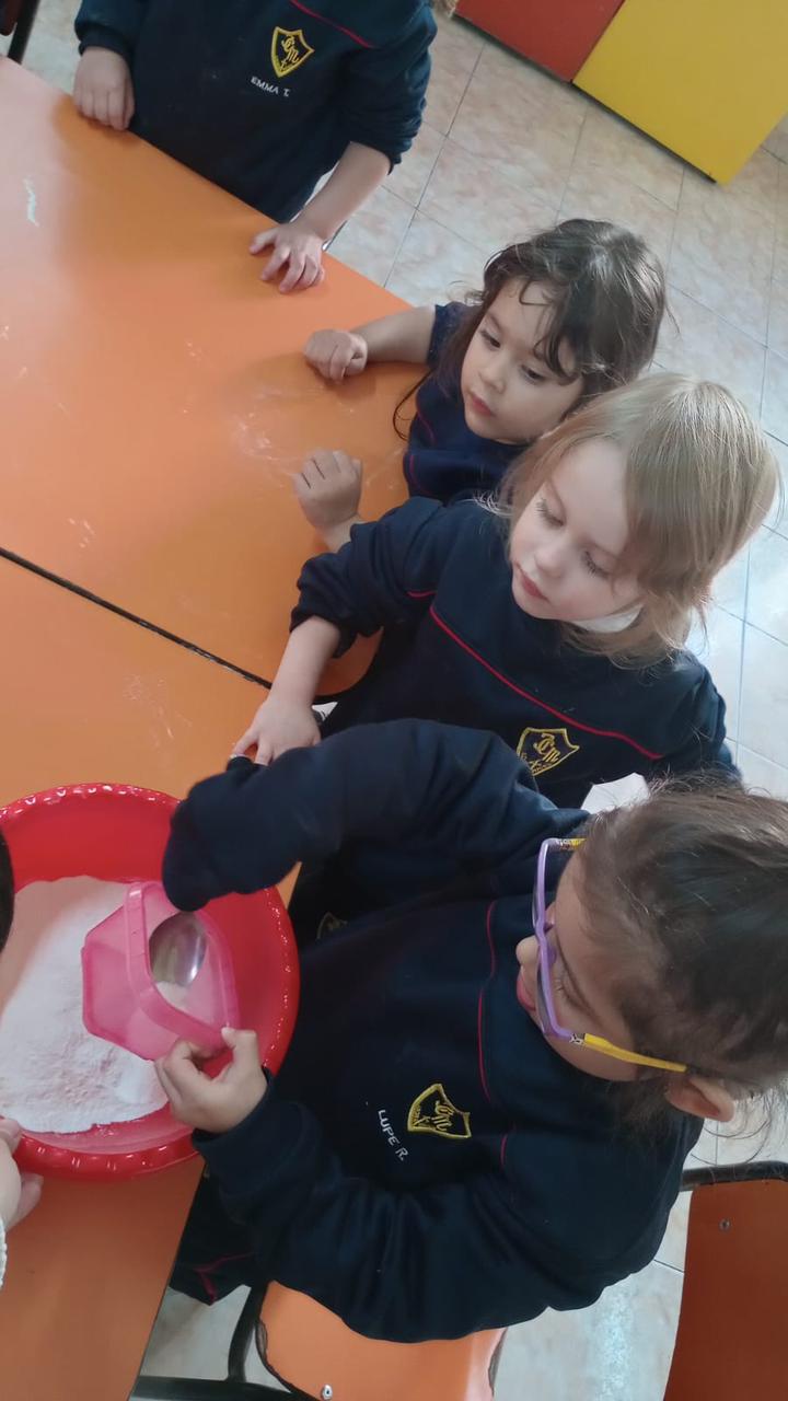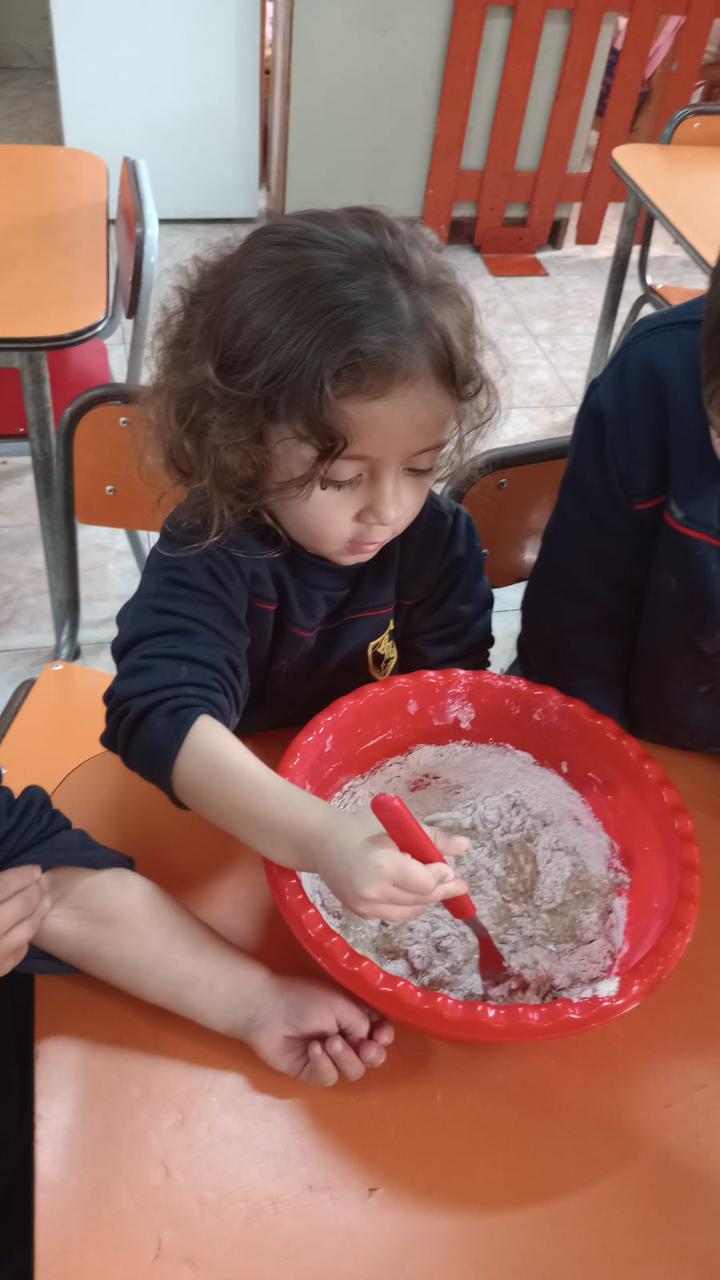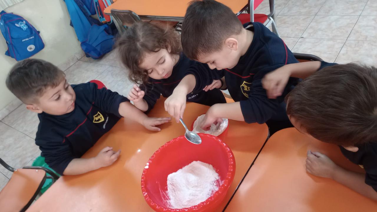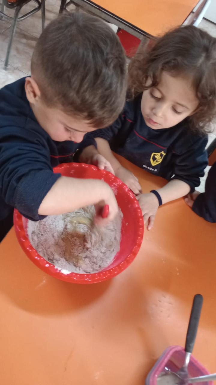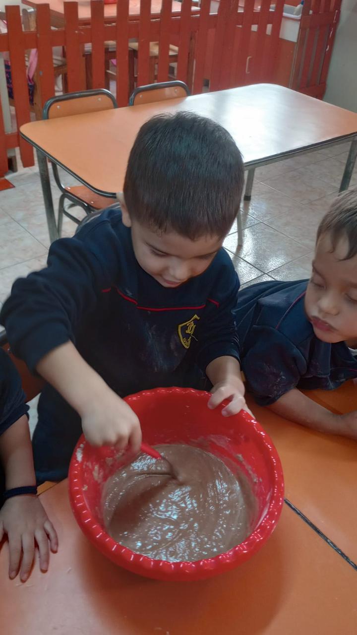 Con mucha atención y entusiasmo, los pequeños cocineros contaron cada cucharada de los ingredientes necesarios. Descubrimos juntos qué lleva una torta: harina, azúcar, huevos, cacao, aceite y un toque especial.. mucho amor.