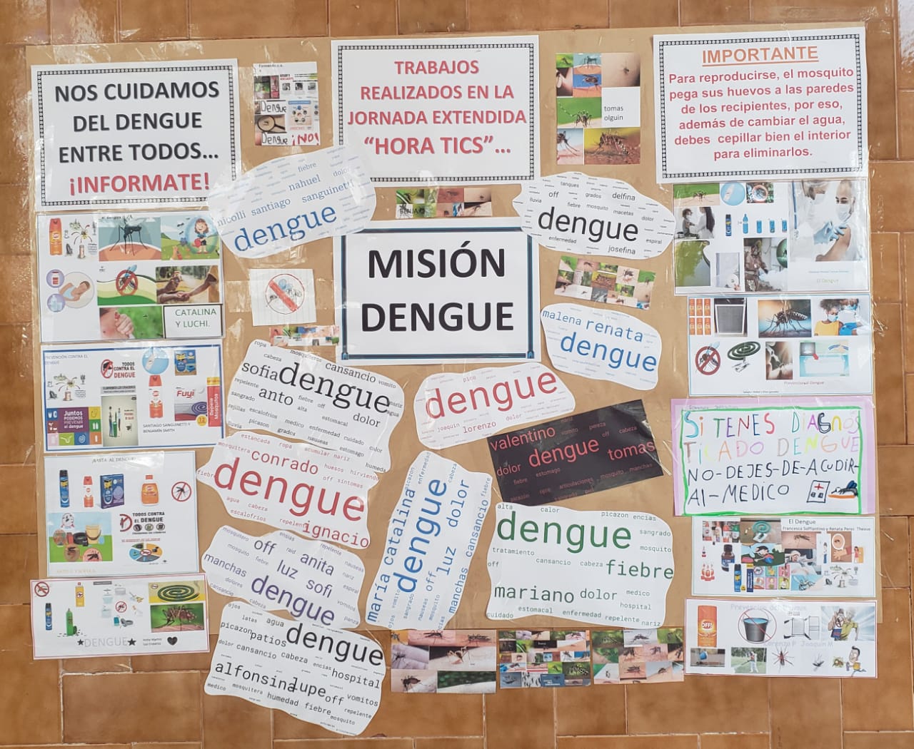Estudiantes de tercero, quinto y sexto grado de Jornada Extendida, en Hora Tics, se familiarizaron con la confección de collage y nube de palabras, trabajando con diferentes temas, entre ellos la problemática sanitaria que hoy nos afecta: el dengue. Buscaron, seleccionaron y organizaron imágenes y palabras alusivas al tema, para confeccionar collage y nubes de palabras, poniendo en juego la creatividad e imaginación. Algunas de estas producciones se expusieron en el ingreso del colegio como parte del Proyecto «Misión Dengue».