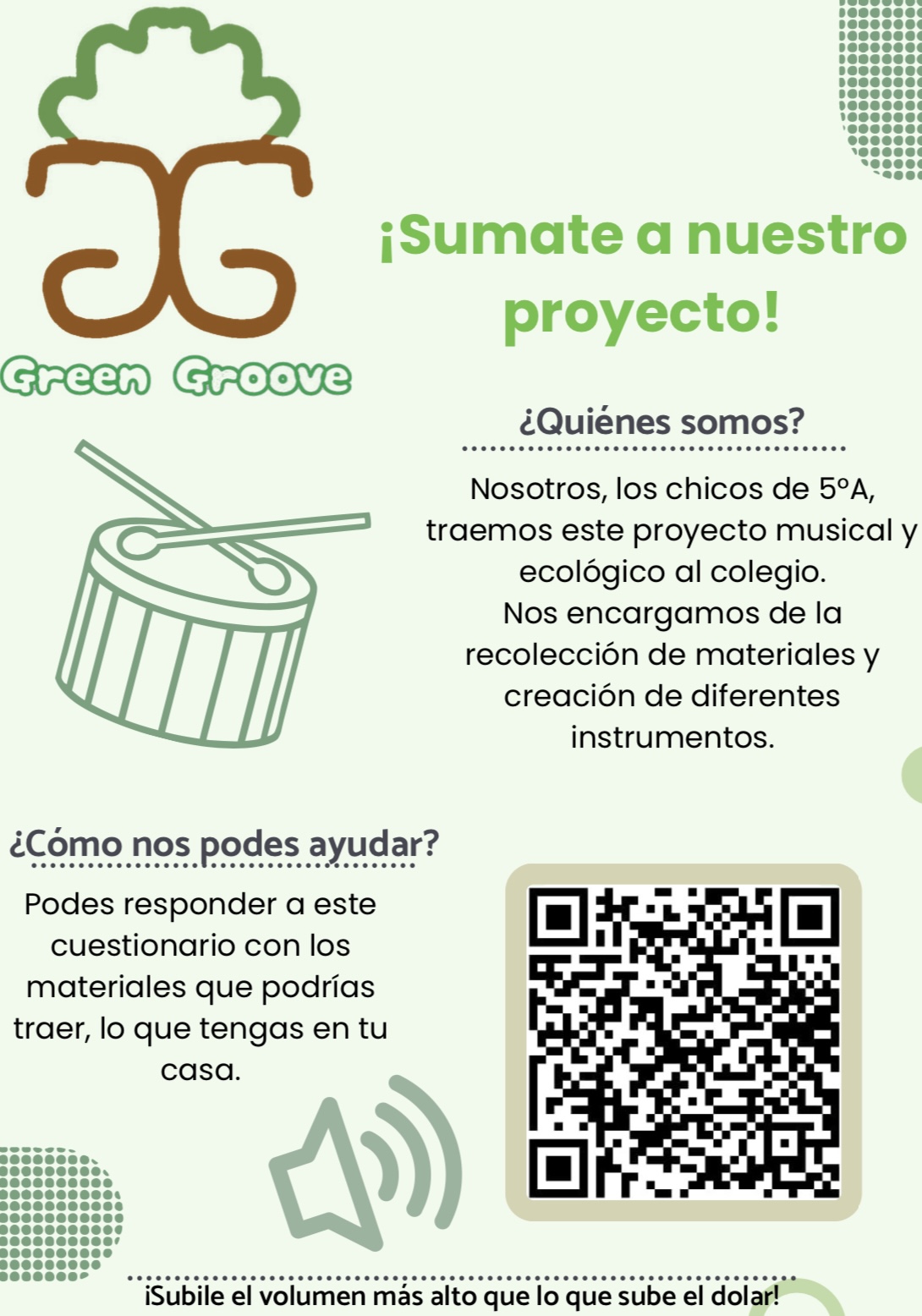Querida Comunidad Adoratriz: les compartimos la información sobre la realización de un proyecto en el área Educación Musical de 5º año «A», a través del cual los estudiantes confeccionarán instrumentos musicales con material reciclado para luego utilizarlos en una presentación a realizarse en la segunda etapa del año lectivo. En el flyer expuesto en la imagen, se les deja un código QR para ingresar a un formulario de google y desde allí poder conocer con qué materiales pueden colaborar. En el mismo encontrarán el mail del profesor encargado del proyecto, Gabriel Dávila, con quien deberán comunicarse antes de enviar cualquier material. Agradecemos desde ya su colaboración. Para visualizar un vídeo alusivo a esta artículo, haga clic en la opción «Leer más» ubicada al final de este artículo, gracias.